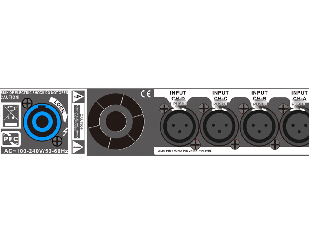 Moderní spínaný zdroj s aktivní korekcí účiníku pracuje v širokém rozsahu napájecího napětí 100-240V a dosahuje účiníku až 0,99 a umožňuje tak použití zesilovače po celém světě bez ohledu na rozvodnou soustavu.