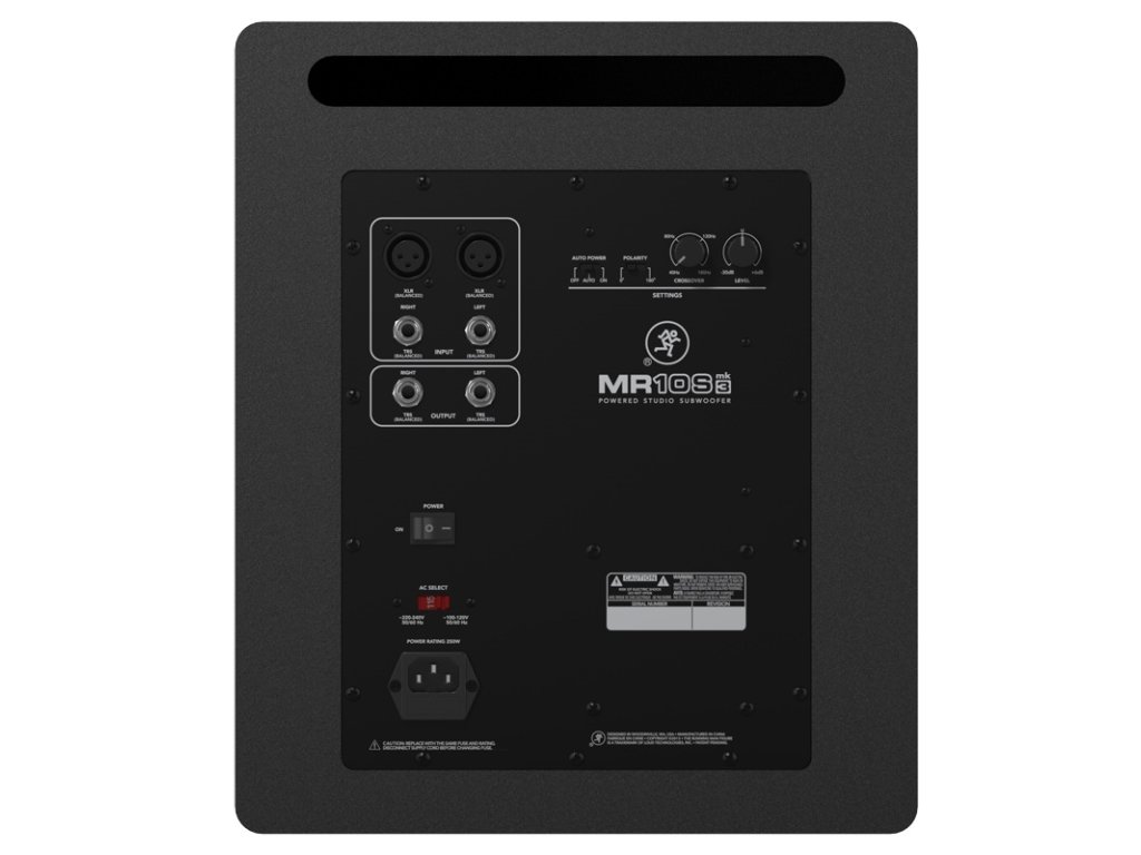 Mackie - MR10S mk III • aktivní studiový subwoofer • 10" • 120W • max spl 113dB • 35Hz-180Hz • vstupy XLR a TRS • zesilovač třídy AB • rozměry 320 x 381 x 381 (mm) • hmotnost 12,4 kg