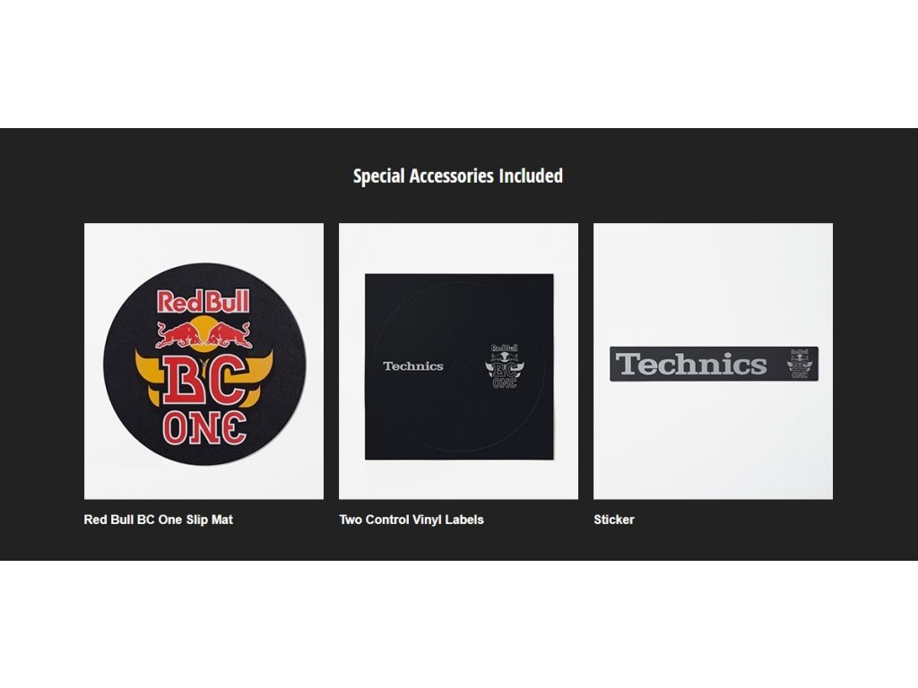 Obsah balení: gramofon, slipmat RED BULL BC ONE, kryt proti prachu, adaptér na 7‘‘ desky, vyvažovací závaží, červená hlavice, sada šroubů pro přenosku, kabel PHONO, zemnící vodič PHONO, napájecí kabel do sítě, uživatelský manuál, samolepka Technics, samolpeky pro control vinyly.